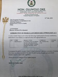 One of the projects, titled “Construction of Inner Roads and Provision of Solar Street Lights in Ikeji-Arakeji,” was reportedly approved and funded. According to documents obtained by journalists, a letter dated July 16, 2024, showed that the lawmaker representing the constituency, Oluwole Oke, requested the Permanent Secretary of the Federal Ministry of Agriculture and Rural Development to award the N500 million contract to MC Aremo Nigeria Limited.