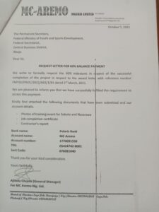 Further findings indicate that the company wrote to the Permanent Secretary of the Federal Ministry of Youths and Sports Development requesting payment of a 60 percent balance for another project linked to the constituency. The letter was signed by Ajibola Olujobi as General Manager.